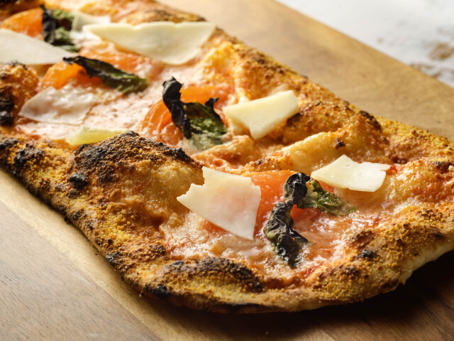 「遠野産トマトのマルゲリータピザ」は、フレッシュな遠野産トマトのトマトをふんだんに使用し、バジルの香り豊かなピザに焼き上げました。モッツアレラチーズとパルメザンチーズのほか、最後にイタリア産羊乳チーズ「ペコリーノ・ロマーノ」をトッピング。トマトの酸味とチーズの塩味、バジルの香りの組合わせをお楽しみください。