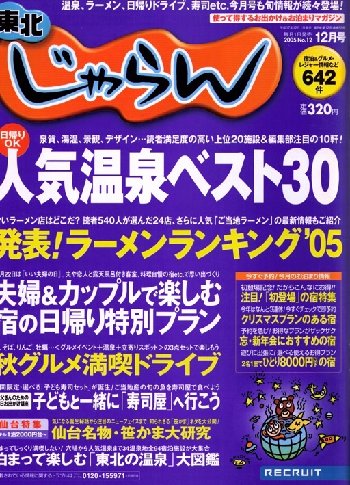 TOP メディア掲載 『東北じゃらん(2005年12月号)』(リクルート)にて当店が紹介されました。 『東北じゃらん(2005年12月号)』(リクルート)にて当店が紹介されました。 『読売新聞(2005年10月3日号)』(読売新聞社)にて当店が紹介されました。 メディア掲載 『ドライブ A GO!GO!』(テレビ東京)にて当店が紹介されました。