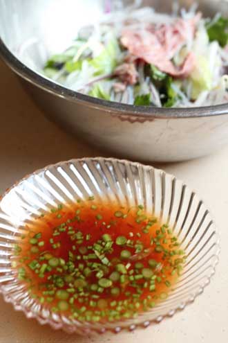 2の野菜と春雨、香菜の葉の半量とラム肉を3のドレッシングで和える。